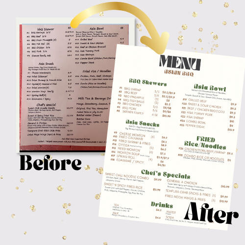 Menus, flyers, and product images that make your business look legit and attract more customers (without the wait or high cost).